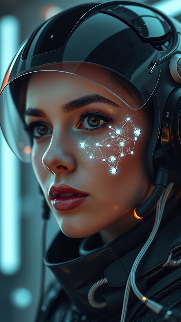 A woman wearing a sleek, high-tech cyberpunk helmet featuring a glossy black surface and intricate robotic details glances forward with intensity. Her face is softly illuminated by a network of radiant silver wires that form a mesmerizing web of glowing patterns across her skin. The scene captures a hyper-realistic, editorial pose with striking photorealism, emphasizing a futuristic theme. The image boasts 8k resolution, ensuring exceptional clarity and definition that highlights every detail of the design. In the background, subtle holographic elements add to the cutting-edge atmosphere, while soft neon lights cast a gentle glow around her. The composition is cinematic, with an aspect ratio of 9:16, enhancing the verticality and impressive style of the portrait.