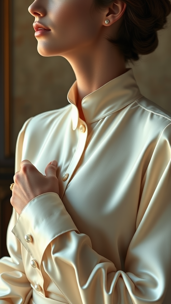 A woman wears a luxurious, alabaster silk blouse that flows gracefully over her silhouette. The blouse features a sophisticated high collar that accentuates her face, while the cuffs, embellished with exquisite pearl buttons, lend an air of grace and femininity. The setting is a stylized, computer-generated 3D scene focusing on fine details, despite being rendered with intentional imperfections for artistic effect, including textural distortions, and an aura of surrealism. The art piece plays with themes of distorted reality and transformation, incorporating subtle elements like abstract anatomy, elongated features, and dreamlike proportions that blur the line between elegance and fantasy.