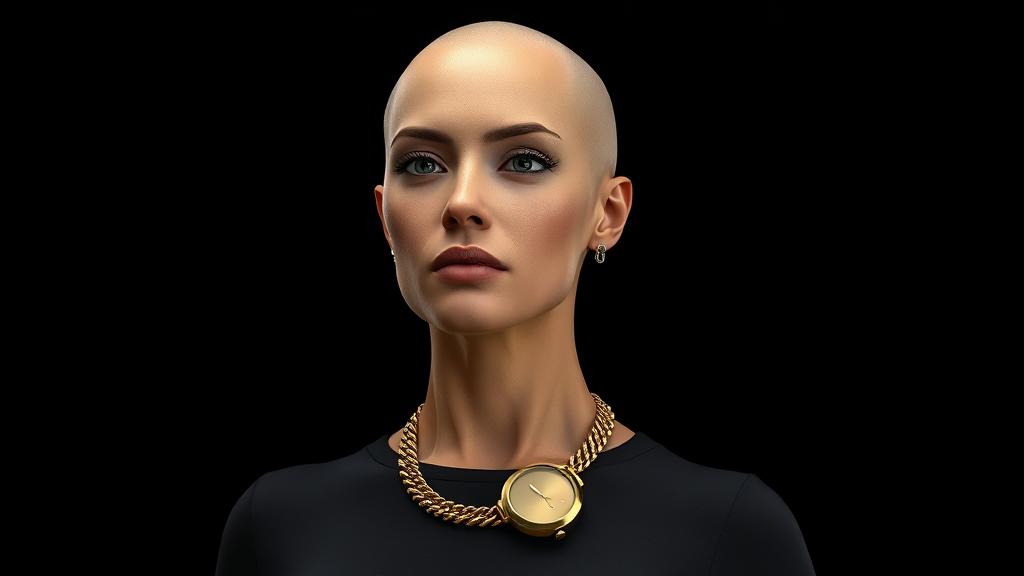 A woman with a bald head stands in full growth against a black background, wearing a gold watch around her neck, portrayed in 3D realism. The scene is enhanced with cinematic lighting, capturing high detail and rendering a dramatic, lifelike presence, set in an aspect ratio of 9:16. She exudes an aura of strength and elegance, with subtle reflections and shadows adding depth to the composition.