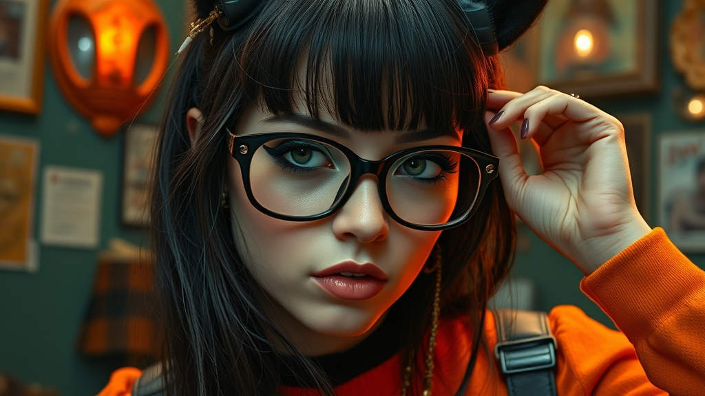 A woman with a goth girl aesthetic reminiscent of Velma from Scooby-Doo, dons eye glasses and an orange top. Her look is infused with a goth style mood, featuring dark eye makeup. This scene embodies the artistic flair of Jessica Drossin and kitsch elements, with a nod to Kieron Gillen and golden age aesthetics, all illustrated in the vibrant, detailed approach of Dima Dmitriev. Life-size figures and a playful catcore vibe add an imaginative twist to the atmosphere.
