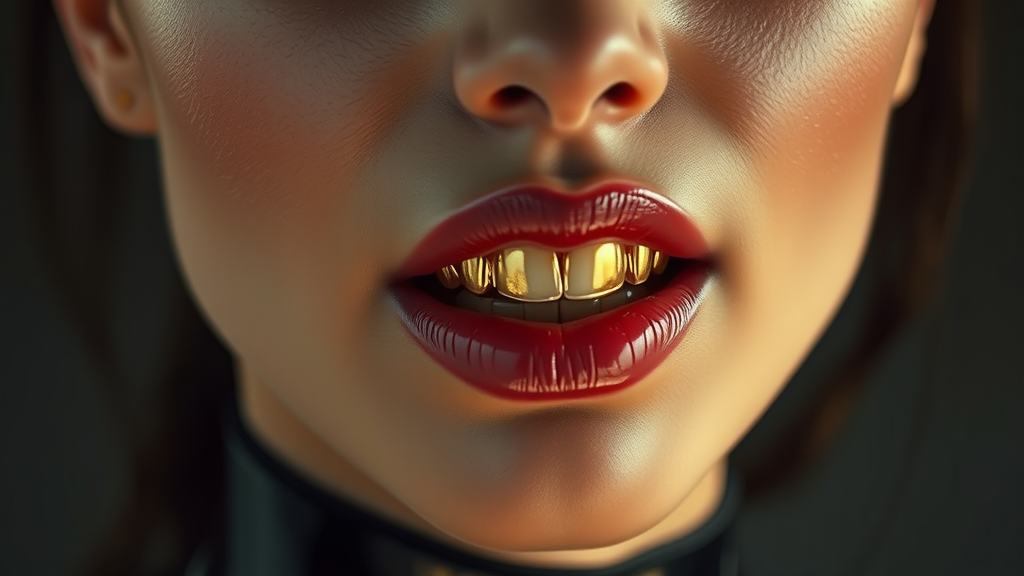A woman with a prominent jawline and gleaming gold teeth, envisioned in a futuristic minimalist style. The composition employs restrained forms and elements of dark romance, reminiscent of the Bechers' typologies. The scene is characterized by a glossy finish and intricate details, focusing on close-up shots that capture the essence of elegance and strength.