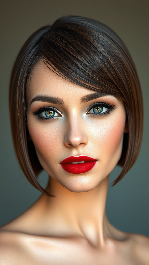 A woman with a sleek, modern bob haircut grazes just above her shoulders, her hair a deep chestnut hue with subtle highlights that shimmer and enhance her natural depth. Her makeup is impeccably applied, featuring a soft smoky eye complemented by a striking red lip, radiating confidence and sophistication. The image is a 3D render, depicting her with precise detail but maintains some intentional creative imperfections like slight blurring around the edges, offering an artistic touch. Despite low resolution and minor distortions, the overall portrayal captures the essence of elegance and modernity, with a slight abstract charm that playfully defies traditional perfection.