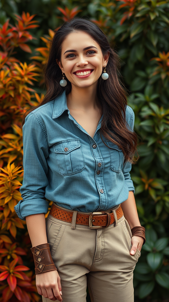 A woman with a small, polished opalite earring reminiscent of a moonlit lake, dressed in a worn yet elegant outfit of blue chambray shirt, khaki pants, and a pair of sturdy, hand-tooled leather ankle boots, while smiling broadly and radiating an aura of quiet contentment amidst a backdrop of lush, vibrant foliage - a fusion of steampunk and solarpunk elements, with intricate laces and brooches adorning her person in a subtle display of craftsmanship, her eyes shining with a warm, earthy light.