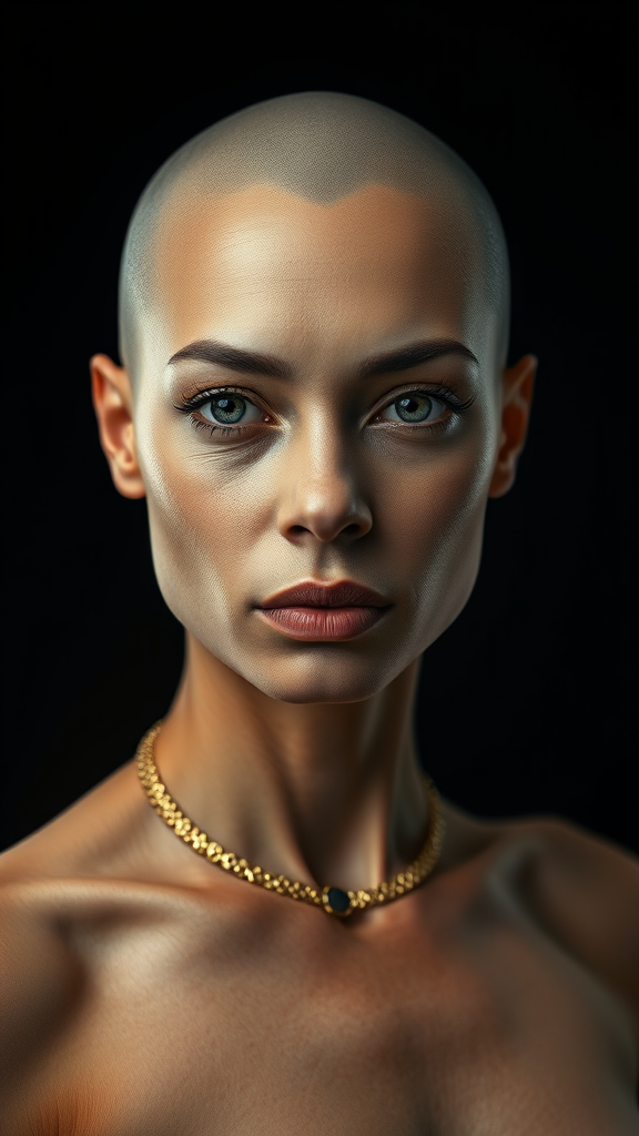 A woman with a smooth bald head stands in full view, wearing a shimmering gold watch elegantly draped around her neck. The background is a deep black, emphasizing the detailed realism of a 3D cinematic render. Soft, cinematic lighting highlights the intricate textures of her skin and the brilliance of the gold, creating a striking, high-detail image shot in a 9:16 aspect ratio.