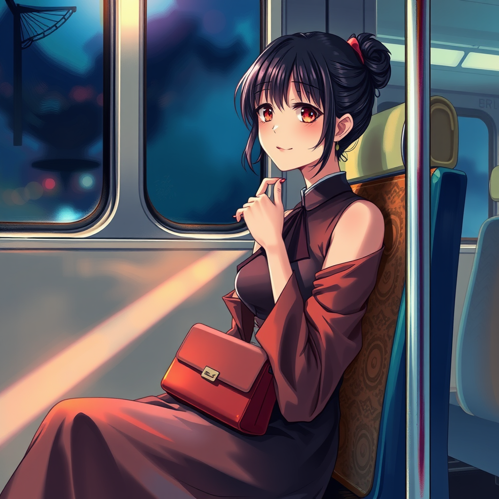 A woman with a thoughtful expression sits on a train seat, clutching a purse in her hand. This scene is depicted in a vibrant anime art style, capturing a delicate balance of aesthetic beauty and surreal elements. The painting is rich in detail, highlighting the unique charm of the woman's features and the intricate fabric of her attire. The ambiance is dreamlike, with a soft play of oversaturated colors that lend an otherworldly quality to the setting. While embracing the idealism of aestheticism, subtle imperfections in anatomy hint at a fantasy world, adding a whimsical and slightly distorted touch to the composition. The focus remains on the allure of the character and the train's gentle sway that surrounds her. The overall image exudes a sense of calm yet captivating energy, inviting the viewer to delve into a story beyond the confines of the immediate scene.