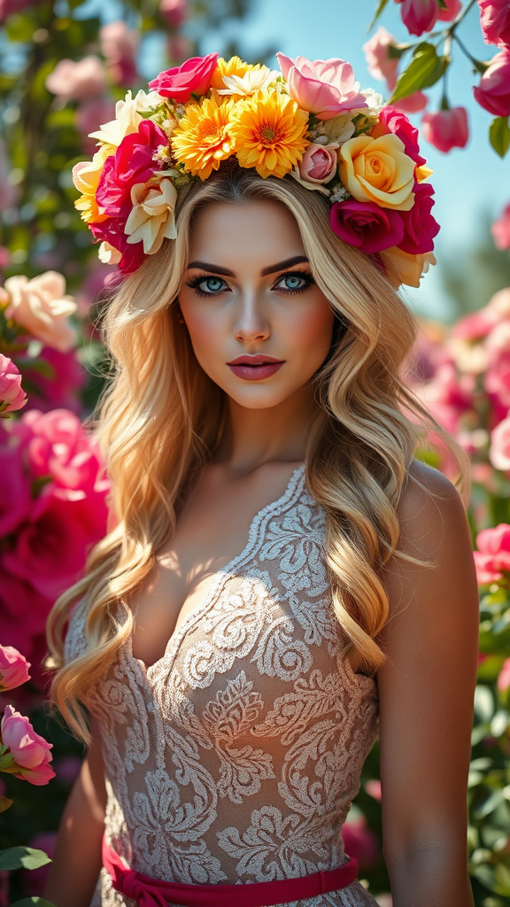 A woman with a vibrant floral headdress, golden blonde hair cascading gracefully over her shoulders, and striking azure eyes, stands amidst a blooming garden on a sunlit day. She wears an alluring outfit adorned with intricate lace patterns that complement the vivid colors of the flowers around her. The scene is alive with realistic textures, from the soft petals to the gentle play of sunlight on her skin, creating an enchanting atmosphere.