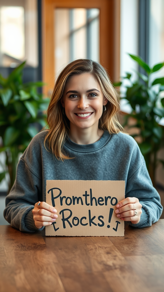 A woman with a warm smile sits casually at a wooden table, donning a cozy, slate-grey sweatshirt. In her hands, she holds a cardboard sign with whimsical handwriting proclaiming "Promthero Rocks!". Her gaze meets the camera with a hint of playful confidence. Behind her, the office ambience is brought to life by lush, leafy plants on either side, softly blurred to highlight her presence. The scene captures a blend of comfort and enthusiasm.