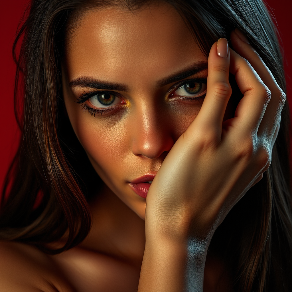 A woman with an introspective expression, her hand gracefully covering part of her face, a bold crimson backdrop enhancing the nuanced details of her features, conveying a sense of mystery, lifelike and ultra-high-definition, intricately detailed, with a gentle play of light and shadow --aspect ratio 9:16 --version 6.
