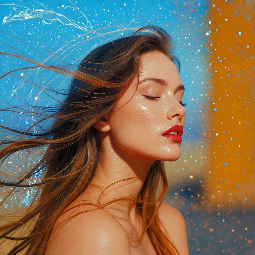 A woman with cascading long hair flowing in the wind, captured in the style of pop-inspired art. The scene features hyper-realistic water that sparkles and dances, reminiscent of animated gifs. The influence of Mario Testino’s photography is evident with a close-up, soft and dreamy focus. Sky-blue and earthy brown tones blend harmoniously in the background, creating a soothing aesthetic. The aspect ratio is tall and slender, emphasizing elegance, with a stylized touch for artistic flair.
