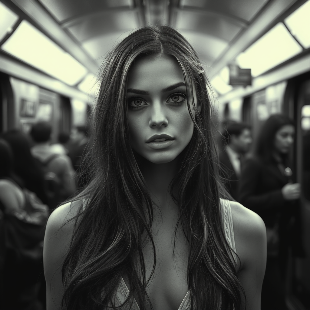 A woman with cascading long hair stands in a bustling subway station, her presence in striking black and white imagery exuding a gritty Hollywood glamour. Her form seems crafted from delicate glass, embodying a soft femininity with exaggerated facial features that draw the eye. The image captures a mesmerizing, captivating gaze, with textures reminiscent of wet-on-wet painting, blending seamlessly into the scene around her. The setting's shadowy depths and intricate details emphasize her allure, elevating the tableau into a timeless moment of mystery and elegance.