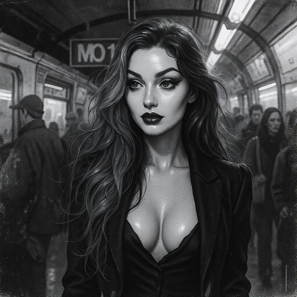 A woman with cascading long hair stands in a bustling subway station, rendered in striking black and white imagery. The scene evokes gritty Hollywood glamour, her features etched in glass-like clarity, embodying soft femininity with exaggerated, expressive facial elements. Her eyes hold a captivating gaze, as if telling a silent story, with the art style displaying wet-on-wet blending techniques. The atmosphere is charged with an undercurrent of elegance amidst the urban chaos, capturing the essence of timeless allure.