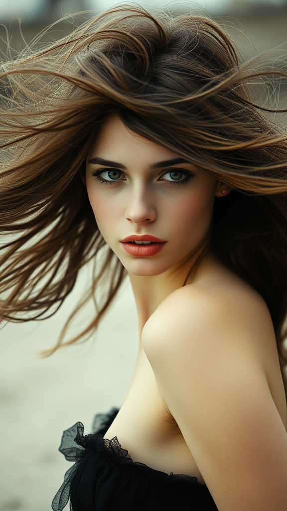 A woman with cascading, untamed hair caught in a gusty breeze, her presence exuding a haunting elegance as if in a snapshot of frozen motion; her captivating gaze pierces through the lens with an ethereal intensity. The scene is captured with the dreamlike imperfections of a toy camera, echoing the artistry reminiscent of a voigtlander bessa r2m. It bears the haunting allure of black paintings, infused with the abstract spirit of the New York School, creating a portrait of surreal beauty and evocative mystery.