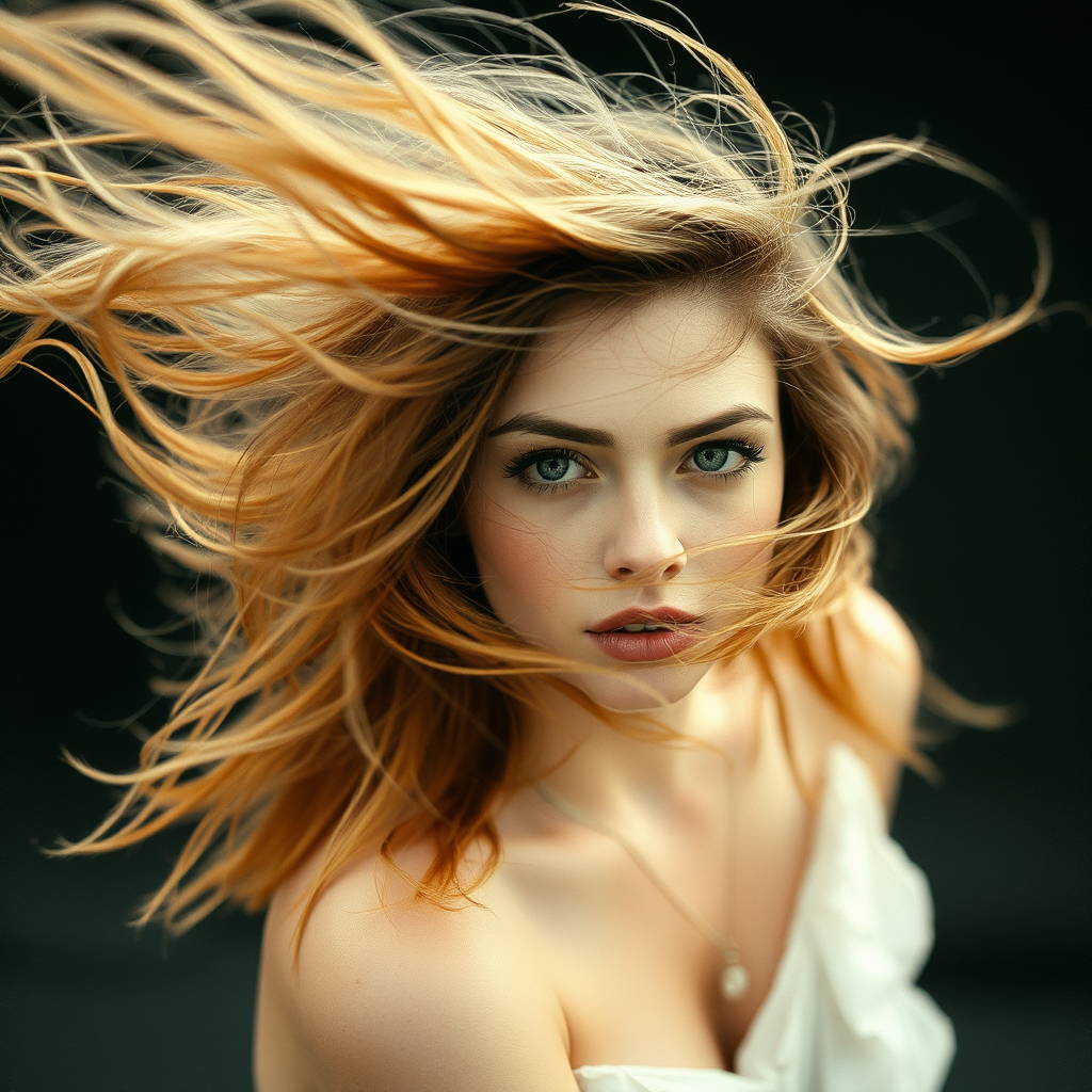 A woman with cascading, untamed hair caught in the wind, evoking the haunting elegance of a moment suspended in time, her captivating gaze penetrating through the scene, like an homage to the enigmatic style of toy camera effects. Inspired by the Voigtlander Bessa R2M, the composition draws on the moody tones of black paintings, with echoes of the New York School's abstract expressionism. The dynamic movement is frozen, yet vibrant, creating a surreal contrast against the soft, blurred edges characteristic of vintage photography.
