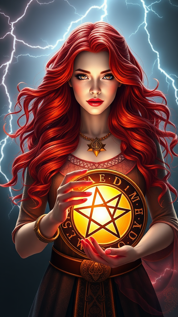 A woman with cascading waves of fiery red hair stands, her hands cradling a radiant orb that illuminates her face. Resembling the ethereal beauty of Amy Adams, she exudes an enchanting aura. Her attire shimmers with mystical symbols, blending the elegance of a high priestess with the futuristic allure of an android necromancer. A pentagram shield, etched with ancient runes, floats serenely by her side. Channeling the elemental power of lightning, she conjures an electric spell, its energy crackling through the air. Her presence embodies the grace of an anime deity and the wisdom of a Celtic goddess such as Diana. Her eyes, full of gentle authority, resemble the serene gaze of a tarot high priestess, as she stands depicted in vibrant fantasy art, worthy of its place on platforms like CGSociety and ArtStation.