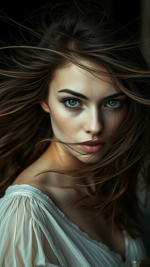 A woman with cascading wild hair caught in a gusty breeze, evoking the charm of toy camera effects, possessing a haunting elegance and a motionless fluidity. Her gaze captivates with intensity. The scene is reminiscent of a Voigtlander Bessa R2M capture, blending the essence of black paintings with the spirit of the New York School. A cinematic portrait with an aspect ratio of 71:128, the image boasts a stylized allure at level 750, maintaining an artistic vibrancy and depth.