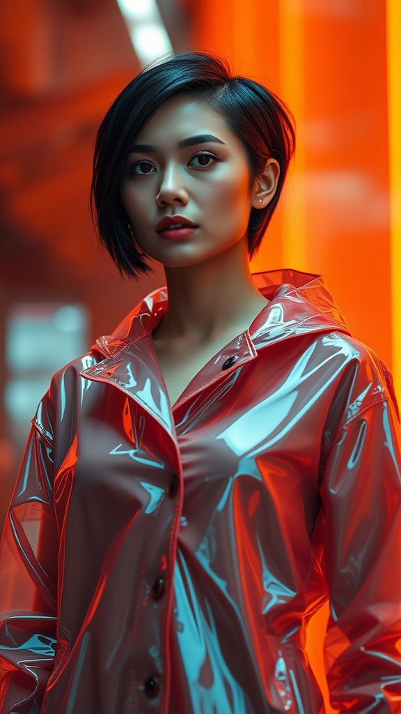 A woman with dark hair stands against a backdrop of warm orange light, wearing a sleek, glossy transparent futuristic raincoat. Her short hair is stylishly arranged, and the scene is bathed in volumetric lighting that adds depth and drama. Captured from a cinematic angle, the image exudes a sense of vibrant glamour.