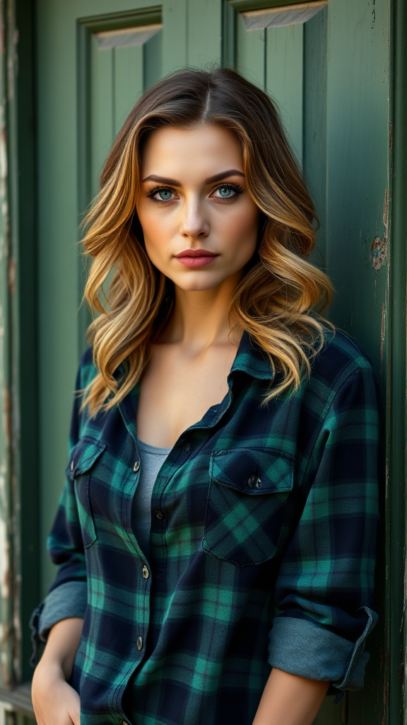 A woman with fair skin and natural, wavy hair cascading in gentle waves around her shoulders stands by a weathered green door frame with chipped paint, adding a rustic charm to the scene. Her eyebrows are finely defined, and her light blue eyes hold a captivating gaze. She wears a green and navy plaid shirt with the top buttons left open to reveal a gray undershirt underneath, and the sleeves are casually rolled up to her elbows. Her posture is relaxed, with one hand resting on the door frame and the other tucked in a pocket, giving her a thoughtful, serene expression.