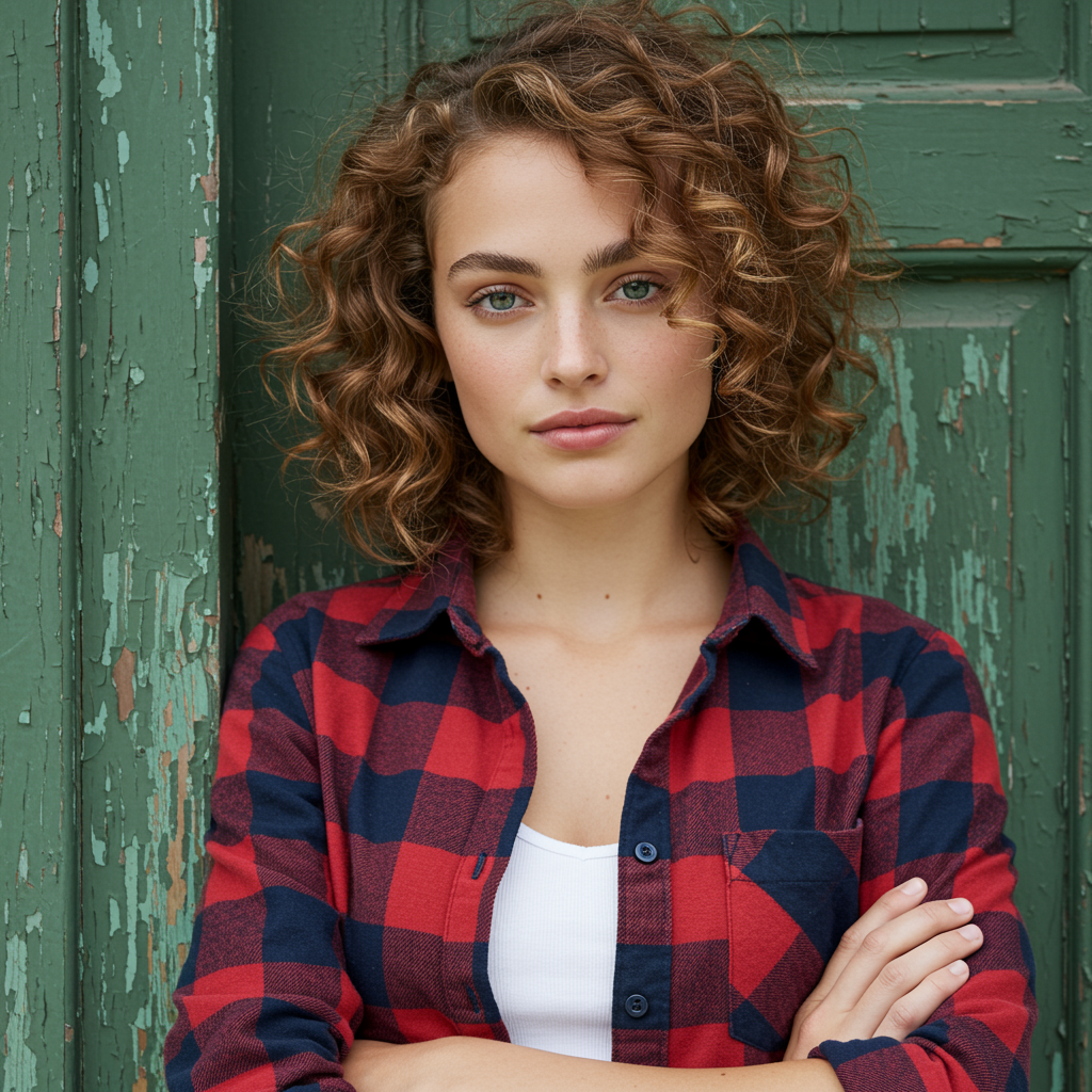 A woman with fair skin and natural, wavy hair styled in soft curls frames her face, enhancing her defined eyebrows and light-colored eyes that captivate attention. She's clad in a red and navy plaid flannel shirt, casually unbuttoned at the top to reveal a simple white undershirt beneath, and the sleeves are comfortably rolled up to her elbows. She leans with relaxed elegance against a weathered green door frame, its peeling paint adding an authentic rustic charm to the setting. Her arms are casually crossed, and she wears a gentle, thoughtful expression that suggests a moment of introspection.