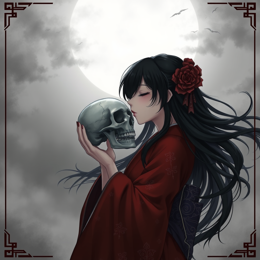 A woman with flowing black hair, wearing a crimson kimono adorned with subtle gothic patterns, tenderly kisses a skull in a hauntingly beautiful scene. The setting is a misty, moonlit night, with gray shadows casting a dramatic atmosphere. Her eyes are closed in a moment of serene connection, and intricate, anime-inspired character designs lend an air of mystery and elegance. The artwork captures a strong sense of realism, with detailed textures and a delicate balance between light and shadow. The scene is framed in black and white, enhancing the gothic allure, with subtle touches of crimson to add depth, reminiscent of Andreas Rocha's evocative style and Japanese-inspired art.