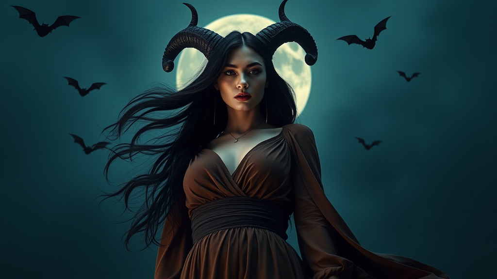 A woman with flowing, dark hair and elegantly curved horns stands with a commanding presence in a rich, earth-toned dress. A shadowed, misty setting envelops her, while bats flutter around, enhancing the mysterious ambiance. Her hair, long and dark, cascades in loose waves that contour her striking features. Her brown attire harmonizes with her dark hair and horns, creating a captivating contrast. The backdrop is a shadowy, mist-laden expanse, with bats flitting about, contributing to the supernatural scene. Subdued lighting, accented by a luminous full moon behind her, envelops her in a soft, otherworldly glow. The viewpoint is upward, adding to her imposing aura. The fantasy art style emphasizes intense lighting and vivid hues, captured through a digital SLR or mirrorless camera equipped with a wide-angle lens to encompass the broad, enigmatic setting.