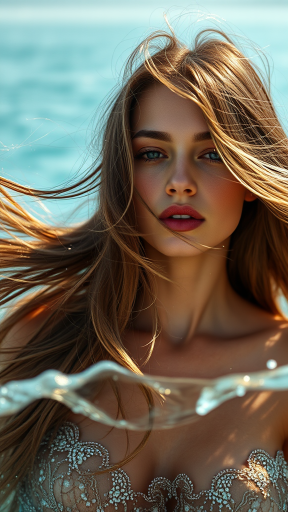 A woman with flowing long hair, caught in a gentle breeze, styled in pop-inspired fashion, surrounded by hyper-realistic shimmering water, featuring an animated gif-like quality. Captured in the iconic style of Mario Testino, this close-up is soft and dreamy, with sky-blue and earthy brown hues blending seamlessly. The image is elongated, stylized at a high level, and maintains a sense of ethereal beauty and motion.