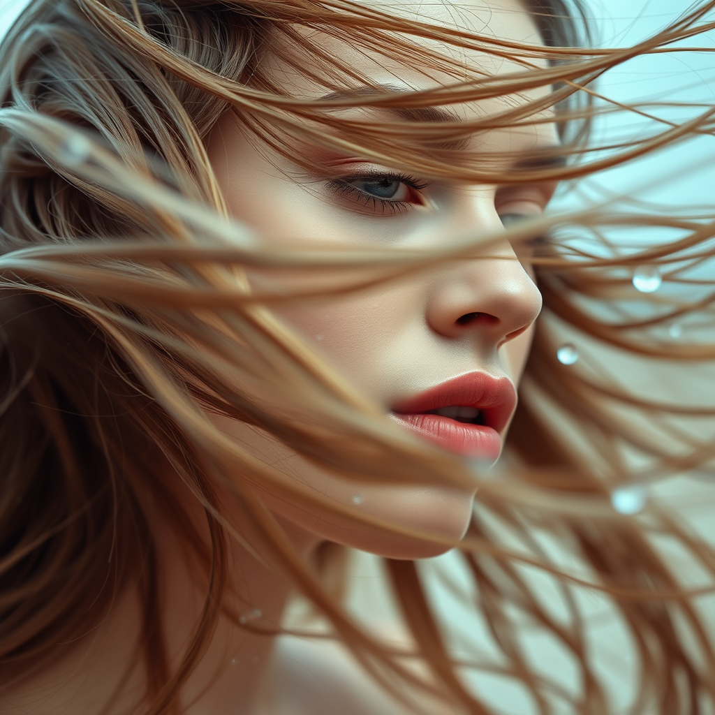 A woman with flowing long hair caught in the wind, featuring a pop-inspired aesthetic, with hyper-realistic water elements. The scene embodies animated gif-like movement, reminiscent of Mario Testino's photographic style. The close-up captures a soft and dreamy atmosphere with a gentle color palette of sky-blue and earthy brown tones, in an aspect ratio of 71:128, exuding a stylized allure.