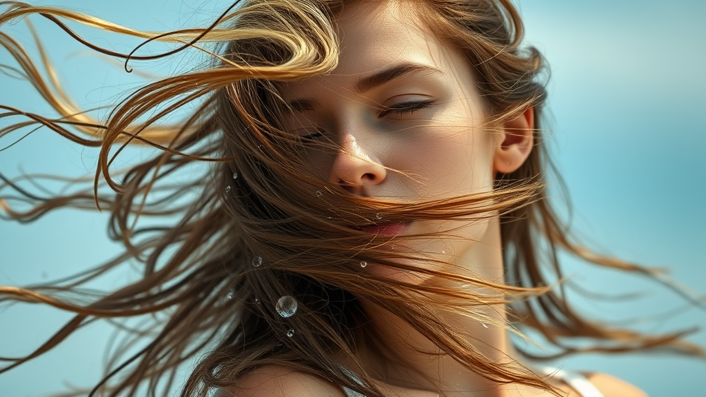 A woman with flowing long hair caught in the wind, styled in pop inspiration with hyper-realistic water elements, reminiscent of animated gifs, captured in the artistic flair of Mario Testino. A close-up view highlights the soft, dreamy quality, featuring sky-blue and brown tones, creating a serene and whimsical atmosphere.