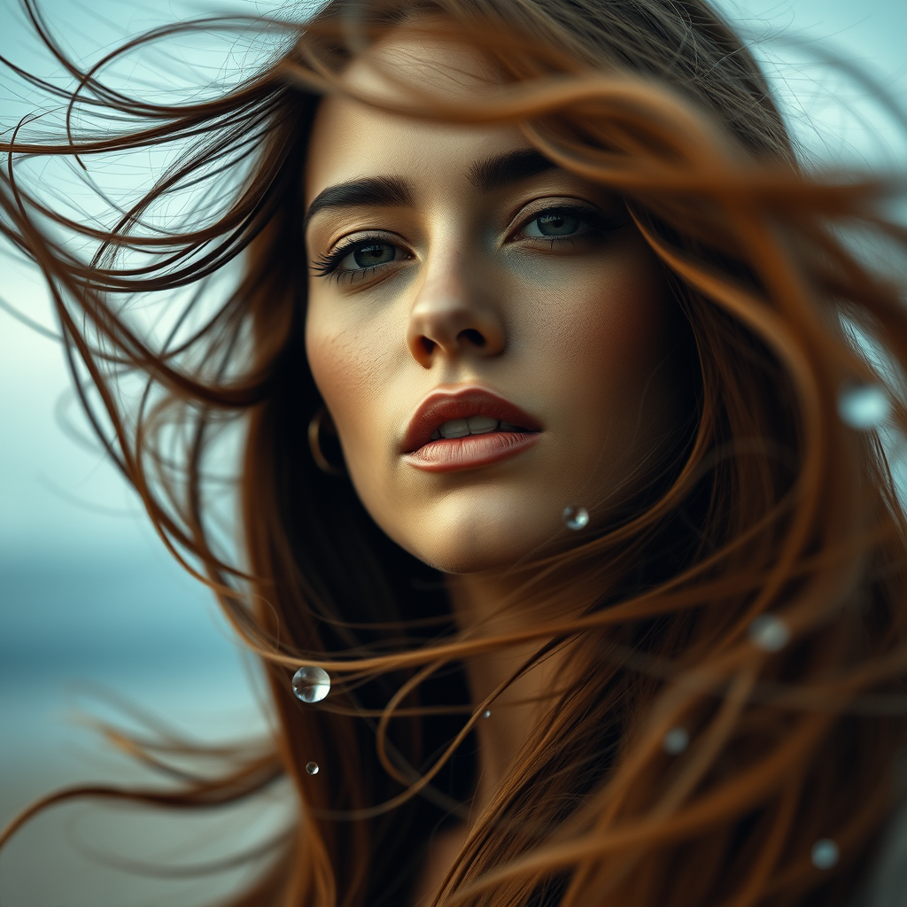A woman with flowing long hair in the breeze, styled with pop art inspiration, hyper-realistic droplets glistening, reminiscent of an animated gif, captured in the sophisticated lens of Mario Testino, an intimate close-up, enveloped in a soft and dreamy ambiance, with hues of sky-blue and rich brown.