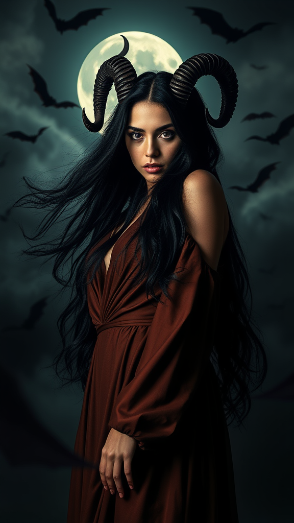 A woman with flowing, raven-black hair and slender, spiraled horns, clad in an earth-toned, elegant dress, stands against a shrouded, mist-laden backdrop, with shadowy bats swirling around her, enhancing the haunting ambiance. Her hair cascades in loose, wild waves around her shoulders, accentuating her striking features. She wears a gown in shades of deep mahogany that harmonizes with her dark tresses and horns. The background is enveloped in a dense, swirling mist with bats fluttering through the air, contributing to the otherworldly scene. Dim ambient light sets the mood, as a luminous full moon looms behind her, casting her in a mystic silhouette. Shot from a low angle, the perspective emphasizes her commanding presence, capturing her in a larger-than-life portrayal. This image is crafted in a fantasy art style, focusing on dynamic lighting and rich, vivid hues. The photograph is captured with a state-of-the-art digital SLR or mirrorless camera using a wide-angle lens to encompass the broad, atmospheric setting.