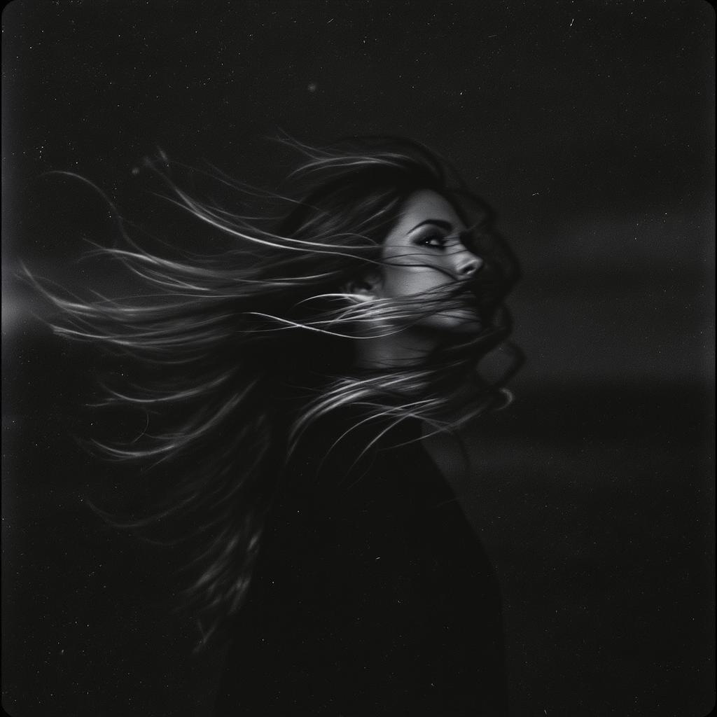 A woman with flowing, untamed hair caught in the gusty embrace of a windy day, evoking the aesthetic of toy camera effects, imbued with haunting elegance and a sense of frozen movement. Her captivating gaze draws you in, reminiscent of the artistry of the Voigtlander Bessa R2M style. The scene is painted in rich, dark tones akin to black paintings, infused with the abstract expressionism of the New York School. The atmosphere is one of controlled chaos, where motion is suspended in time.