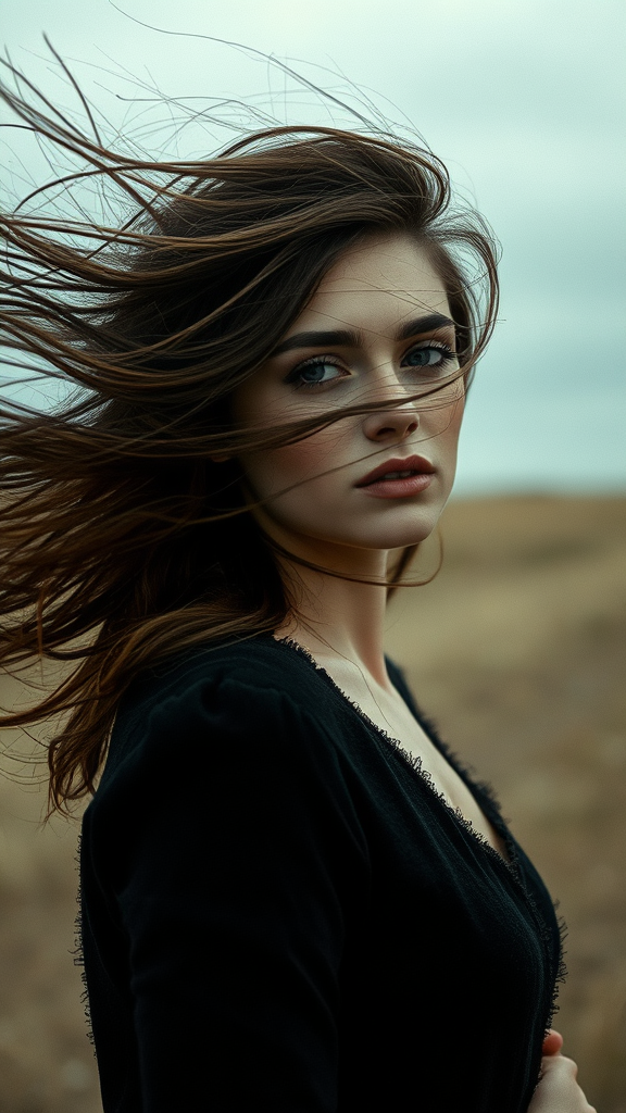A woman with flowing, untamed hair on a blustery day, captured in the style of toy camera effects, exuding a haunting elegance with frozen motion and a mesmerizing gaze, reminiscent of Voigtlander Bessa R2M, inspired by dark-hued paintings and the New York School's artistic essence, evoking a sense of timeless beauty amidst a dramatic, windswept backdrop.