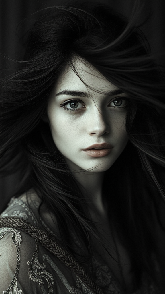 A woman with flowing untamed hair swept by the breeze, captured in the whimsical style of toy camera effects, exuding haunting elegance and frozen movement. Her captivating gaze draws you in, reminiscent of the Voigtlander Bessa R2M’s depth. The scene echoes the essence of black paintings with a touch of New York School’s abstract charm, offering a portrait of ethereal mystery and artistic allure.