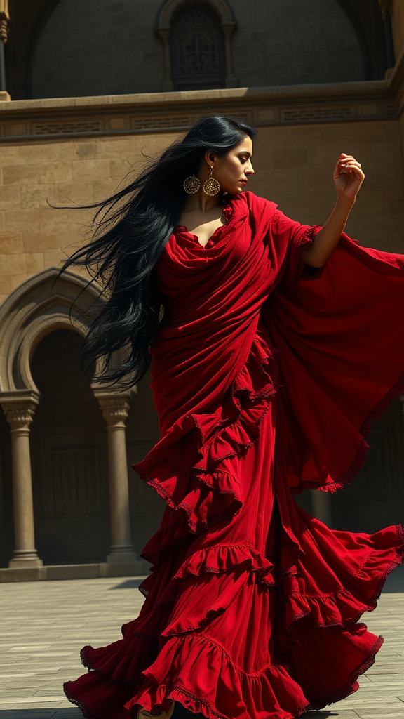 A woman with four intricate giant earrings, her black hair flowing down her back, wears a very long dress adorned with frills and flounces. She is draped in a huge shawl, and her attire features a striking red-black palette. Behind her looms a backdrop of Mudéjar and Romanesque architecture. Captured in a dynamic dancing pose, she embodies passion, grace, and emotion. The scene is an epic composition with tribal dark fantasy elements, where dramatic shadows enhance the intensity of the moment, reminiscent of a painting by Fabian Perez.
