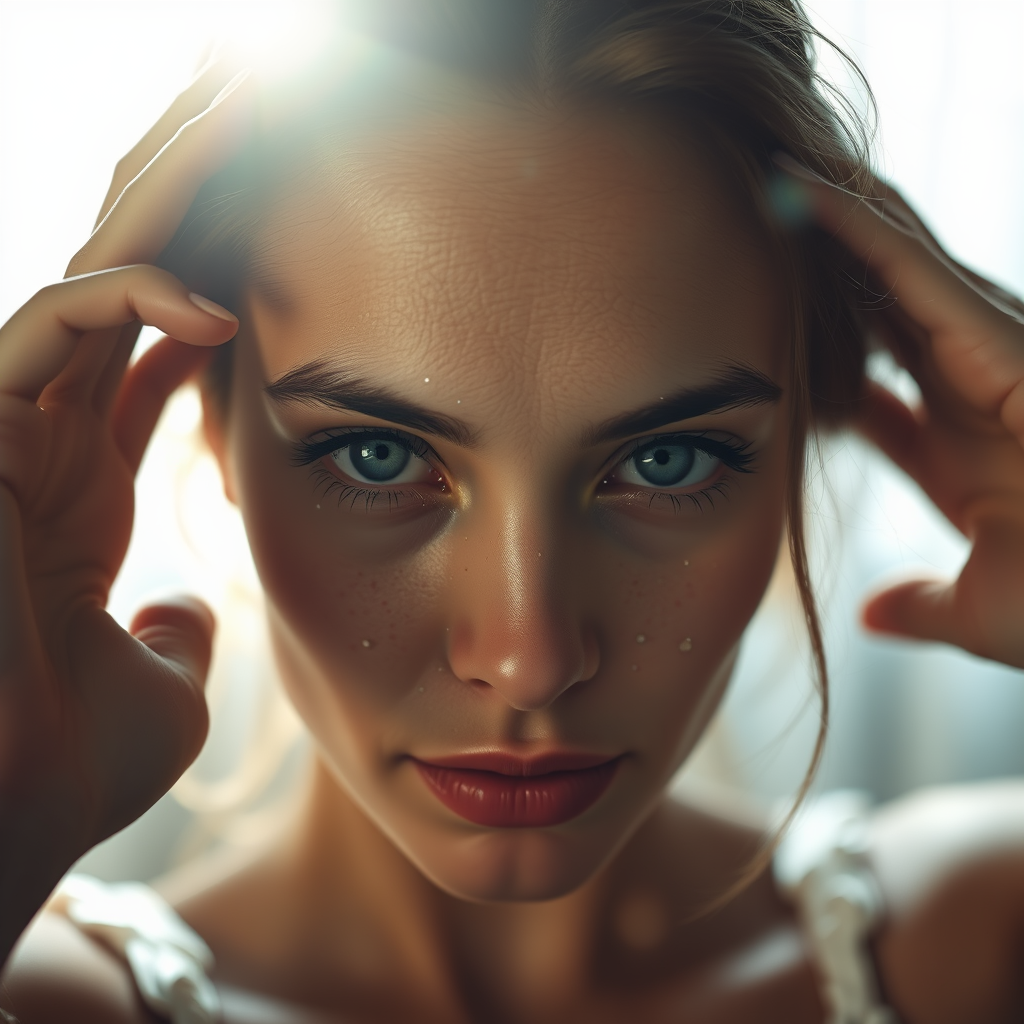 A woman with freckled skin captures a selfie, her face illuminated by soft, ambient light. The photograph is styled in the manner of Dmitry Kustanovich, featuring delicate textural modeling and a unique blend reminiscent of photobashing. The essence of Felicia Simion's dreamy, ethereal touch is evident. The image boasts UHD quality, with elements echoing Ekaterina Panikanova's intricate layering. A subtle overlay of glittery and shiny accents enhances the composition, adding a magical allure to her expression, against a slightly abstract, ethereal backdrop.