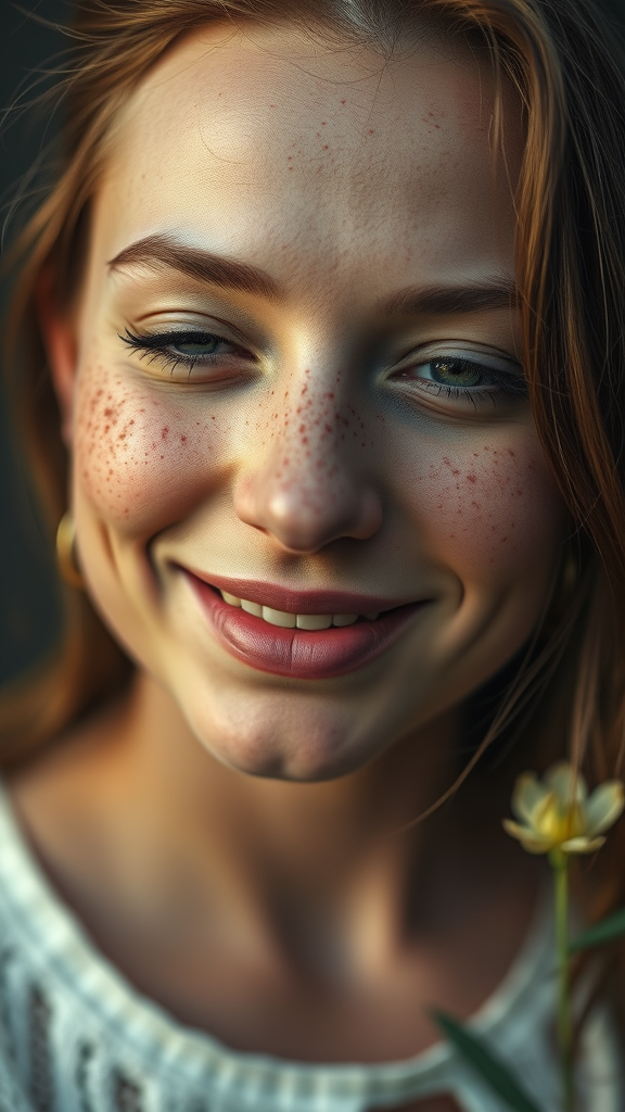A woman with freckles displaying a serene smile, embodying a blend of calming energy and naturecore elements, captured in a photograph with a provia-like aesthetic. The image emphasizes figurative precision, exuding a soothing, sleepycore vibe with gentle, expressive features. The atmosphere is infused with a subtle yet intense energy, drawing from the beauty of natural surroundings.