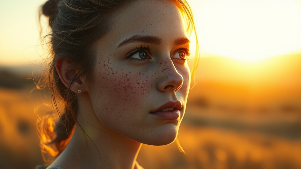 A woman with freckles gazes thoughtfully across a sunlit landscape, her face illuminated by the warm glow of a setting sun. Her expression conveys a deep curiosity and sense of wonder. The scene is captured in a photorealistic style, blending the natural warmth of white and soft orange hues. Her features are accentuated by the intricate play of light and shadow, evoking a sense of fawn-like innocence and connection to nature. The image embodies a blend of vray and photobash techniques, resulting in a striking and emotive portrayal, with a harmonious balance between intensity and serenity.