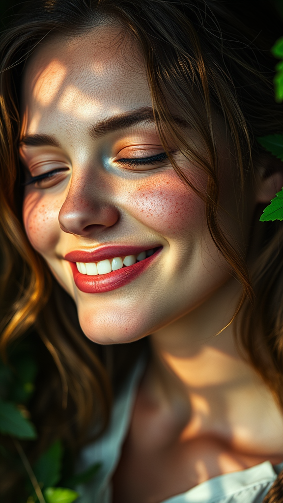 A woman with freckles radiating a serene smile, embodying a harmonious blend of calming essence and vibrant energy, immersed in naturecore aesthetics. Captured with the vivid tones of Provia, the image showcases figurative precision, exuding a peaceful yet dynamic presence. Her gentle expressions evoke a dreamy, sleepycore ambiance, enveloped in a lush natural setting.