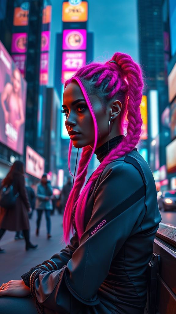 A woman with glowing neon pink hair and intricately braided locks sits pensively on a bench in a bustling cyberpunk city, captured in ultra-detailed 4k realism. Her harlequin-inspired attire contrasts with her somber expression, accentuated by heavy eyeliner that highlights her sadness. Cinematic lighting casts dramatic shadows across her face, with the vibrant city lights reflecting in her eyes. People move past in the background, their silhouettes blurred and animated against towering holographic billboards and sleek skyscrapers, enhancing the futuristic ambiance of the scene.