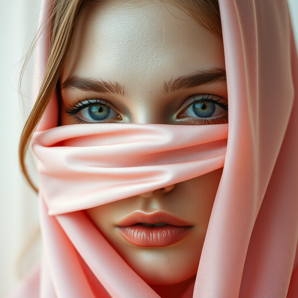 A woman with her eyes gently covered by a blush pink silk strip, portrayed in hyperrealism with photorealistic details, UHD quality. The composition embraces soft realism with a soothing pastel color palette, evoking a babycore aesthetic. The image captures a tender, intimate atmosphere, with delicate textures and subtle light play, creating an elongated vertical aspect ratio, enhancing the serene and ethereal mood.