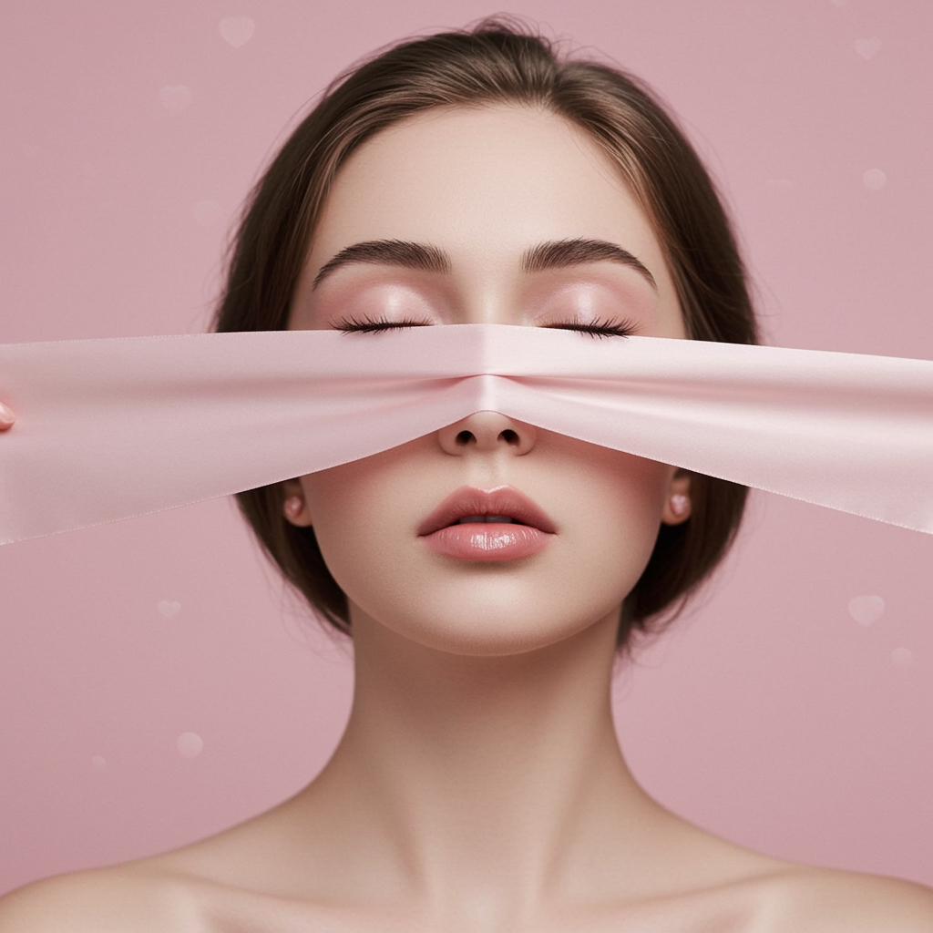 A woman with her eyes gently covered by a delicate silk pink strip, portrayed in an ultra-high-definition, hyperrealistic and photorealistic style. The image captures a serene and dreamy atmosphere, using soft realism with pastel shades. It exudes a whimsical, babycore aesthetic, emphasizing innocence and tranquility. The scene is elongated, with an aspect ratio of 1:2, enhancing the elegance and grace of the subject.