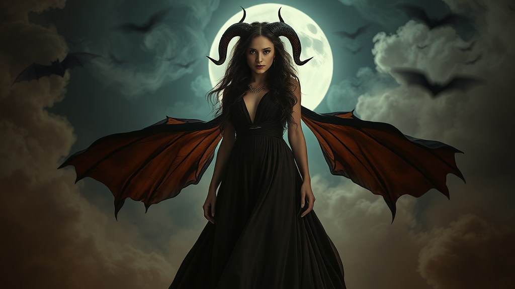 A woman with long, dark hair and curved horns stands in a flowing, dark brown gown, gracefully merging with her rich, wavy locks. Set against a backdrop of swirling smoke and flitting bats, the scene carries an eerie yet captivating atmosphere. The dim light casts shadows, with a full moon positioned behind her, creating an ethereal halo effect. The perspective is dramatic, with the view angled from below to emphasize her commanding aura. The fantasy art style highlights the dramatic interplay of light and color. The image suggests the use of a high-quality digital camera, employing a wide-angle lens to encompass both the striking figure and the vast, atmospheric background.