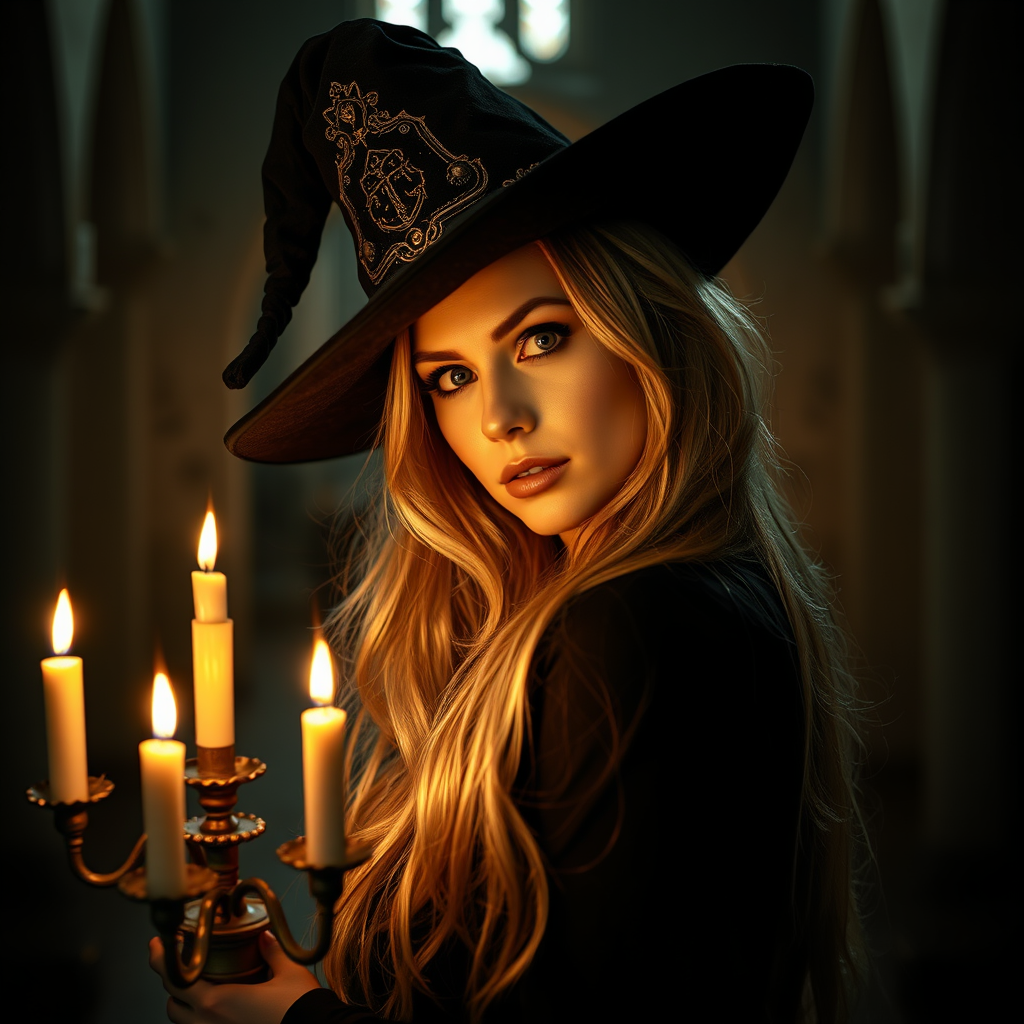 A woman with long, flowing blond hair wears a stylish, ornate, and slightly wonky witch hat that exudes charm and allure. She poses inside a dimly lit monastery, her head tilted gracefully to the side, capturing the spirit of the night. Her fierce eyes lock onto the camera, drawing you in with their intensity. In her hand, she elegantly holds a candelabra, its lit candles casting a warm, flickering light that dances across her features. The ambiance is captured in a vivid art deco style, reminiscent of a Kodak Portra 600 photograph, with soft, warm lighting from below enhancing the mysterious and captivating scene.