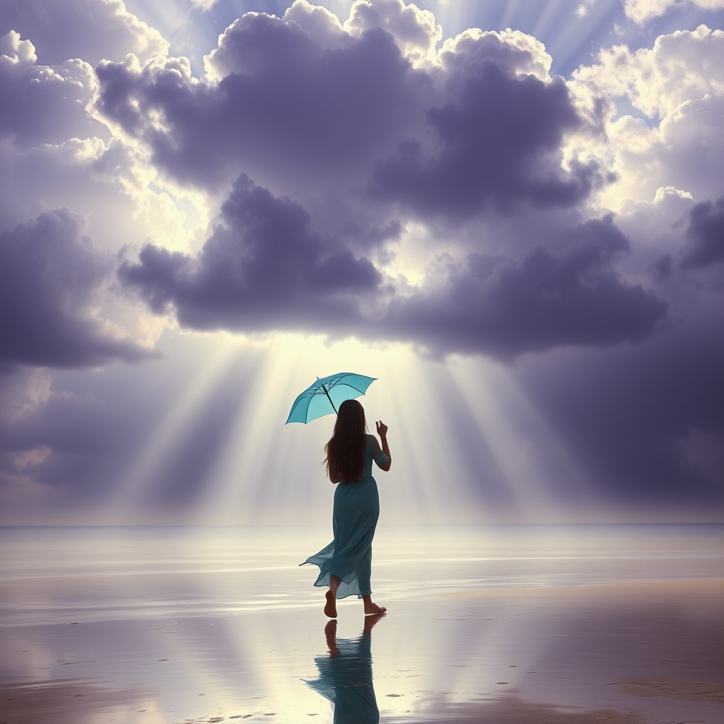 A woman with long hair cascading down to the ground holds a small cyan parasol umbrella. The scene is set on a beach under ominous, partially clouded skies that paint the sky in shades of purple. Sun rays pierce through the clouds, casting ethereal light on wet sand that reflects the woman's silhouette. She walks gracefully amidst the gentle rain, surrounded by beautiful, dramatic cloud formations, evoking a painting by Albert Bierstadt.
