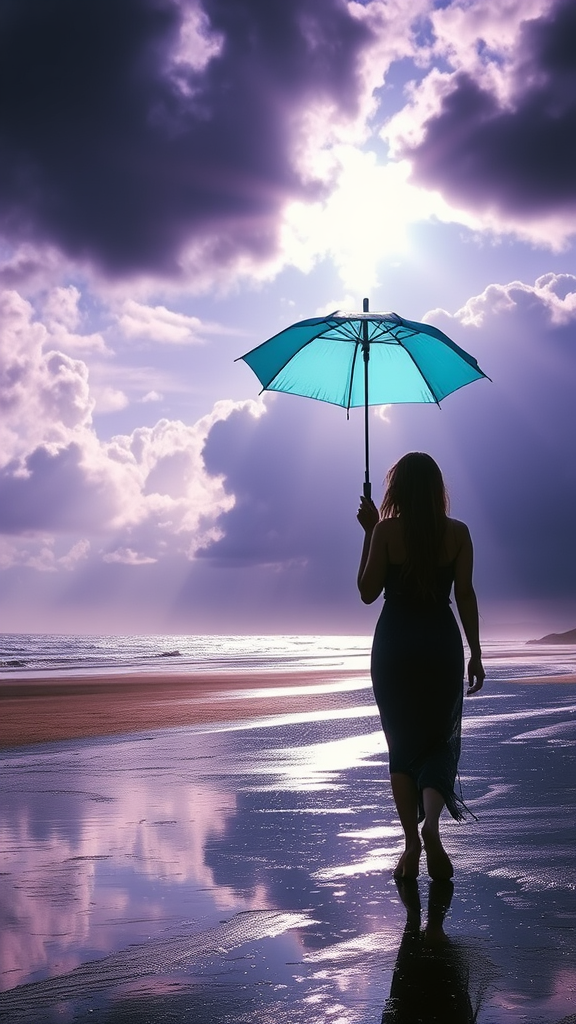 A woman with long hair cascading to the ground, elegantly holding a tiny parasol umbrella with a rich cyan hue, strolls along a beach. The rain creates shimmering wet reflections on the sand, while sun rays pierce through the foreboding clouds above. The sky transforms into a mesmerizing palette of purples and blues, partially veiled by striking clouds. This scene, a silhouette against the vast sky, evokes the luminous landscapes reminiscent of Albert Bierstadt's artistry.