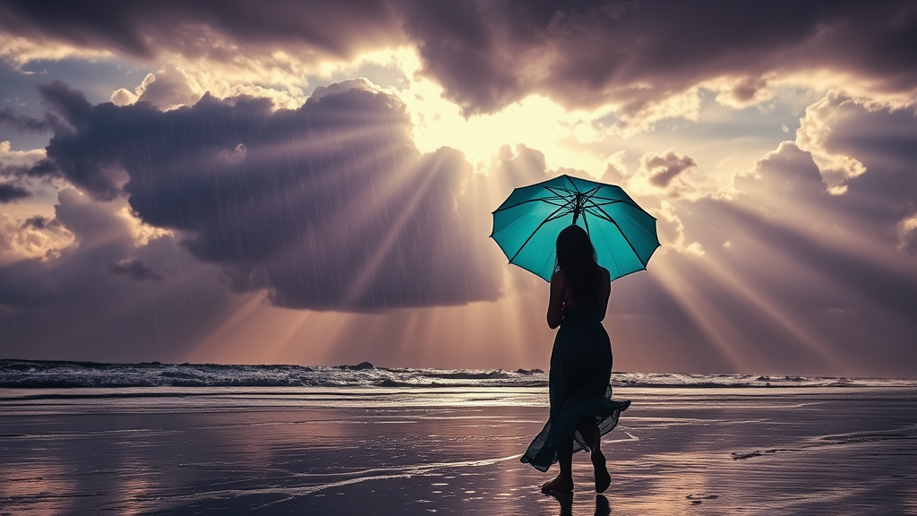 A woman with long hair cascading to the ground walks along the beach holding a cyan parasol umbrella. The scene is set under rain with shimmering wet reflections, while sun rays pierce through breaks in the ominous, beautiful clouds. The sky exhibits a mesmerizing palette of purples and partially clouded areas. Her silhouette is a striking figure amidst the dramatic landscape, reminiscent of a scene painted by Albert Bierstadt, capturing the intricate balance of nature's tumult and serenity.