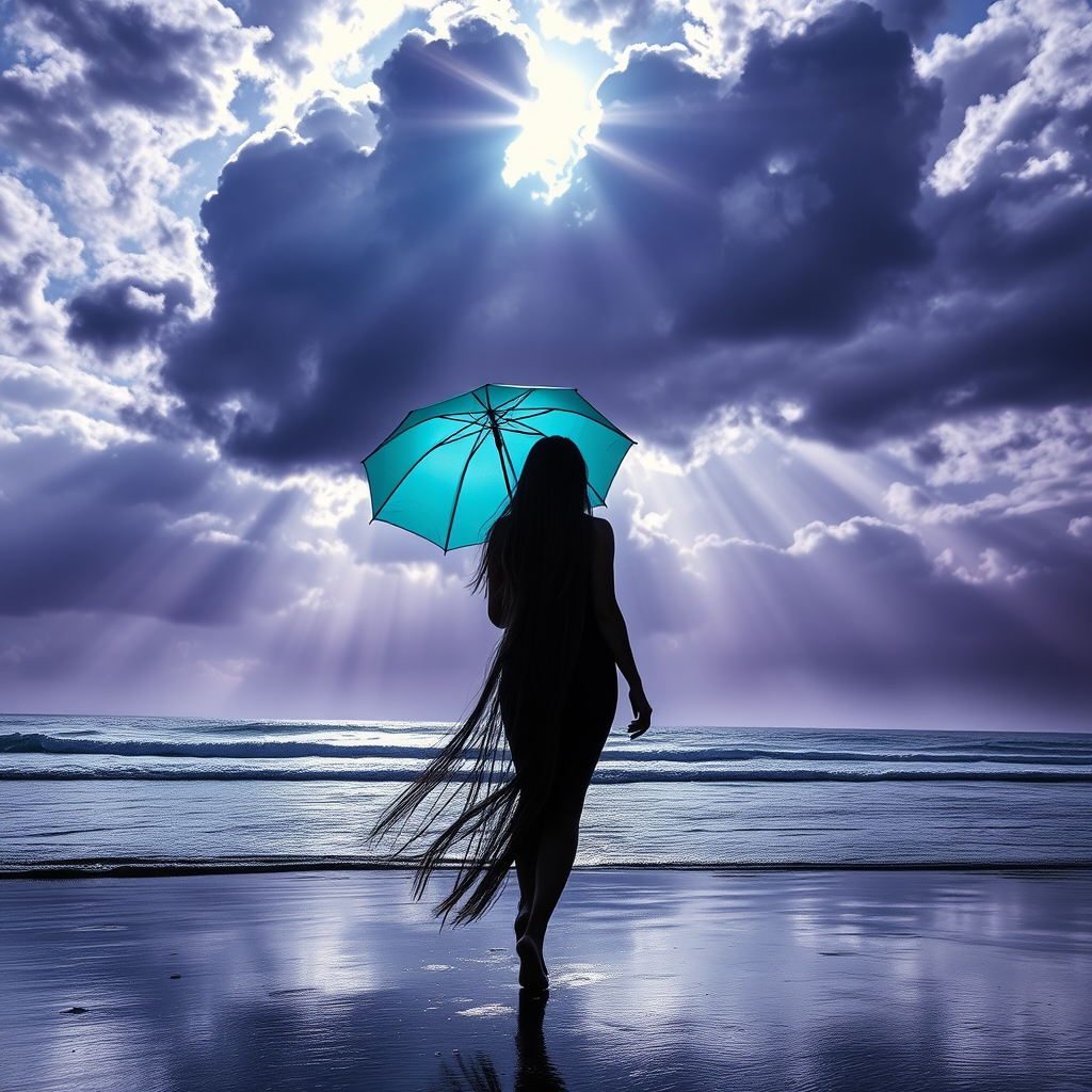 A woman with long hair cascading to the ground walks gracefully along a rain-soaked shore, holding a small, cyan parasol umbrella. Sun rays pierce through foreboding clouds, casting ethereal highlights on wet reflections. The sky swirls with deep purples and intricate cloud patterns, reminiscent of a masterpiece by Albert Bierstadt. Her silhouette is elegantly balanced against the dramatic, partially clouded seaside horizon, capturing a surreal blend of nature’s tumult and beauty.