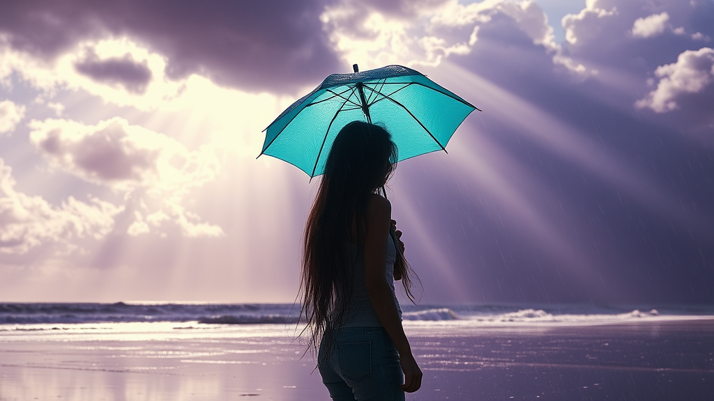 A woman with long hair cascading to the ground walks under a tiny cyan parasol umbrella. She's surrounded by the shimmering wet reflections caused by light rain. Sun rays pierce through the ominous clouds, illuminating her silhouette against a backdrop of a purple-skied beach. The scene is reminiscent of a painting by Albert Bierstadt, capturing the contrast between beautiful cloud formations and partially clouded skies, while her figure moves gracefully amidst the ethereal landscape.