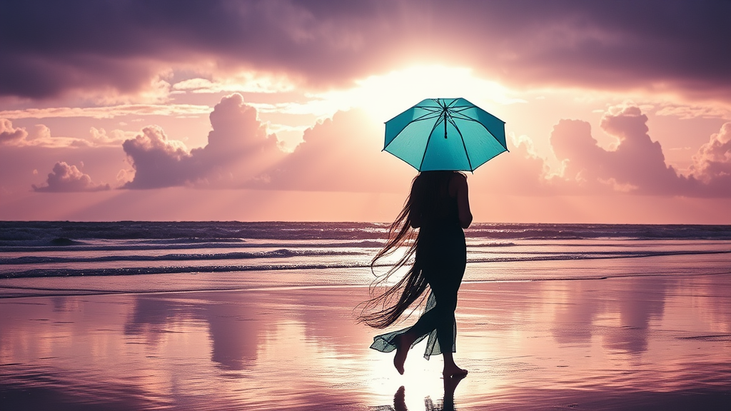 A woman with long hair flowing to the ground walks along the beach under a tiny cyan parasol umbrella. The rain creates shimmering wet reflections around her as sun rays break through the ominous, partially clouded skies. The sky is painted in purples and soft pinks, reminiscent of a serene yet dramatic landscape crafted by Albert Bierstadt. Silhouetted against this breathtaking backdrop, her figure adds mystery and grace to the scene as the beautiful clouds roll by in the distance.