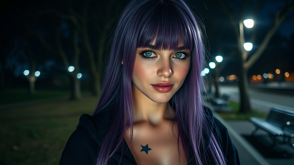 A woman with long purple hair and bangs stands in a park at night, wearing a black hoodie. Her small breasts and an arm tattoo add to her distinct appearance. She has big green eyes and a seductive smile. The dim lights of the park create a mysterious and enchanting atmosphere, enhanced by the realistic quality of an 8k UHD image. Shot with a Nikon Z9, the focus is on her face, capturing every detail with clarity and realism. The background is detailed, with trees and benches subtly visible under the night sky. She exudes confidence with her long neck and seductive look, embodying a captivating presence.