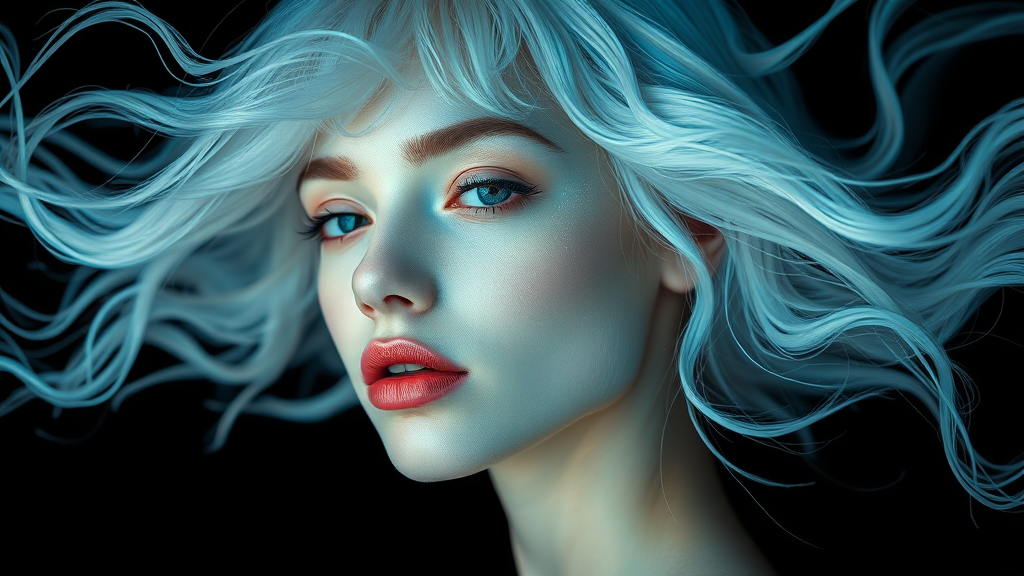 A woman with opalescent hair against a black background, styled in trippy photography with fluid expressionism and distorted bodies. Her detailed facial features are highlighted by a palette of dark whites and light cyan, embodying ghostcore with subtle glowing pastels. The composition is ethereal, capturing a surreal and dreamlike essence.
